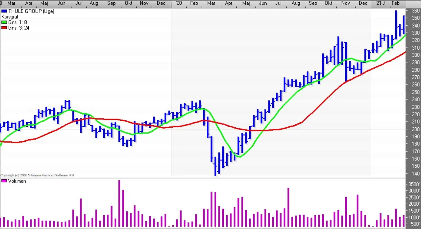 Den positive tendens i aktiekursen trækker op i Momentum og RSI på ugebasis. RSI er over 70. Nærmeste modstandsniveau er ved 395 og herefter i niveauet omkring 425, mens der er støtte i niveauet 320-330 og herefter i niveauet 295-300. Thule-aktien ser interessant ud på niveauet.