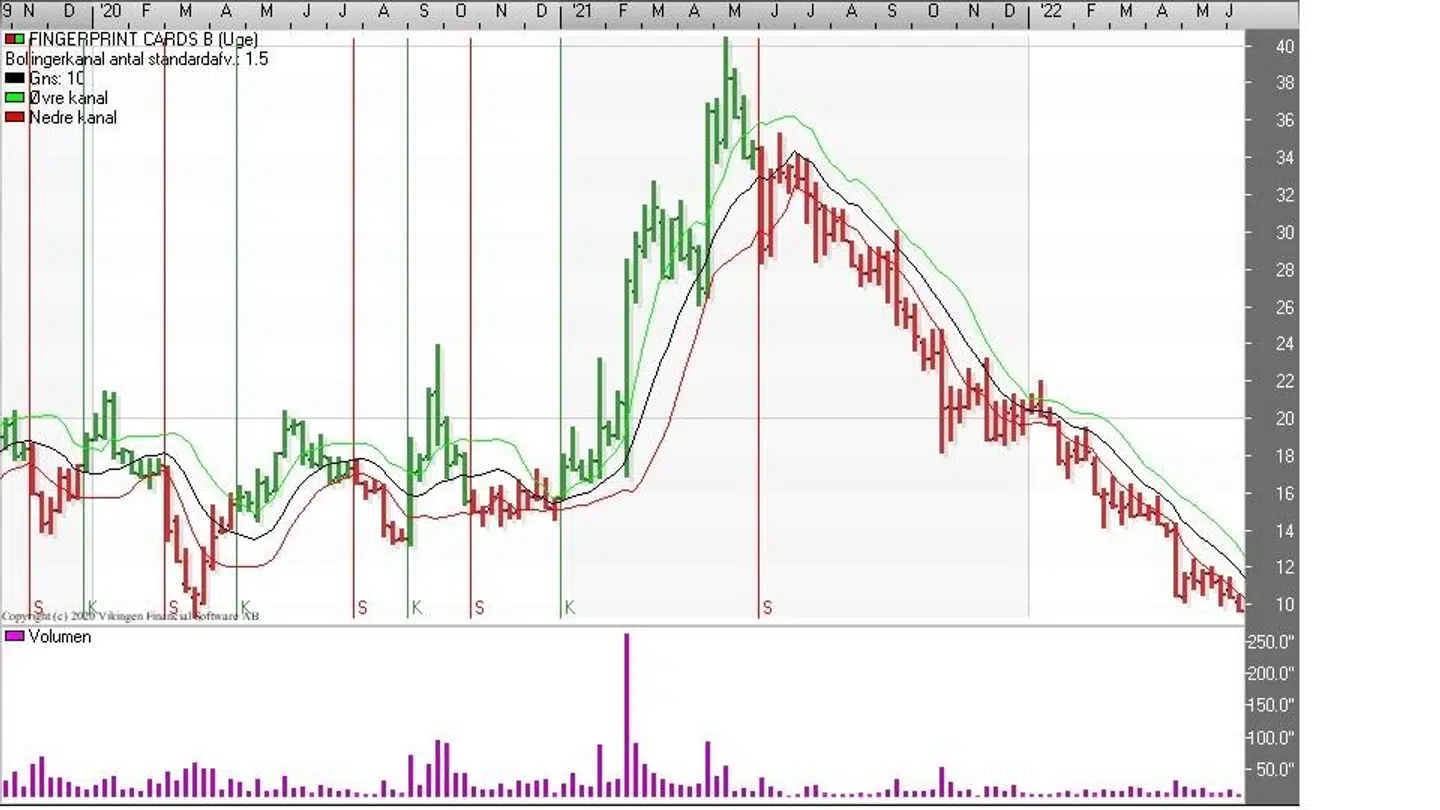På ugebasis blev der etableret salgssignaler i de fleste modeller i løbet af sommeren 2021. Bollingerkanalen fik etableret et salgssignal i niveauet 34 og i fredags sluttede aktien i 9,63, hvilket giver et fald på over 70 pct.