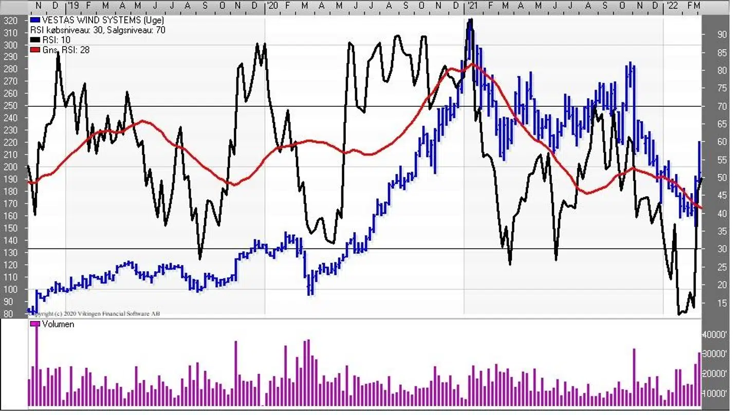De sidste to uger har givet en pæn rebound i aktiekursen. Vestas-aktien ramte kursniveauet 160 i slutningen af januar og konsoliderer sig i niveauet indtil forrige uge, hvor aktien oplevede en kraftig stigning grundet de stigende oliepriser.
