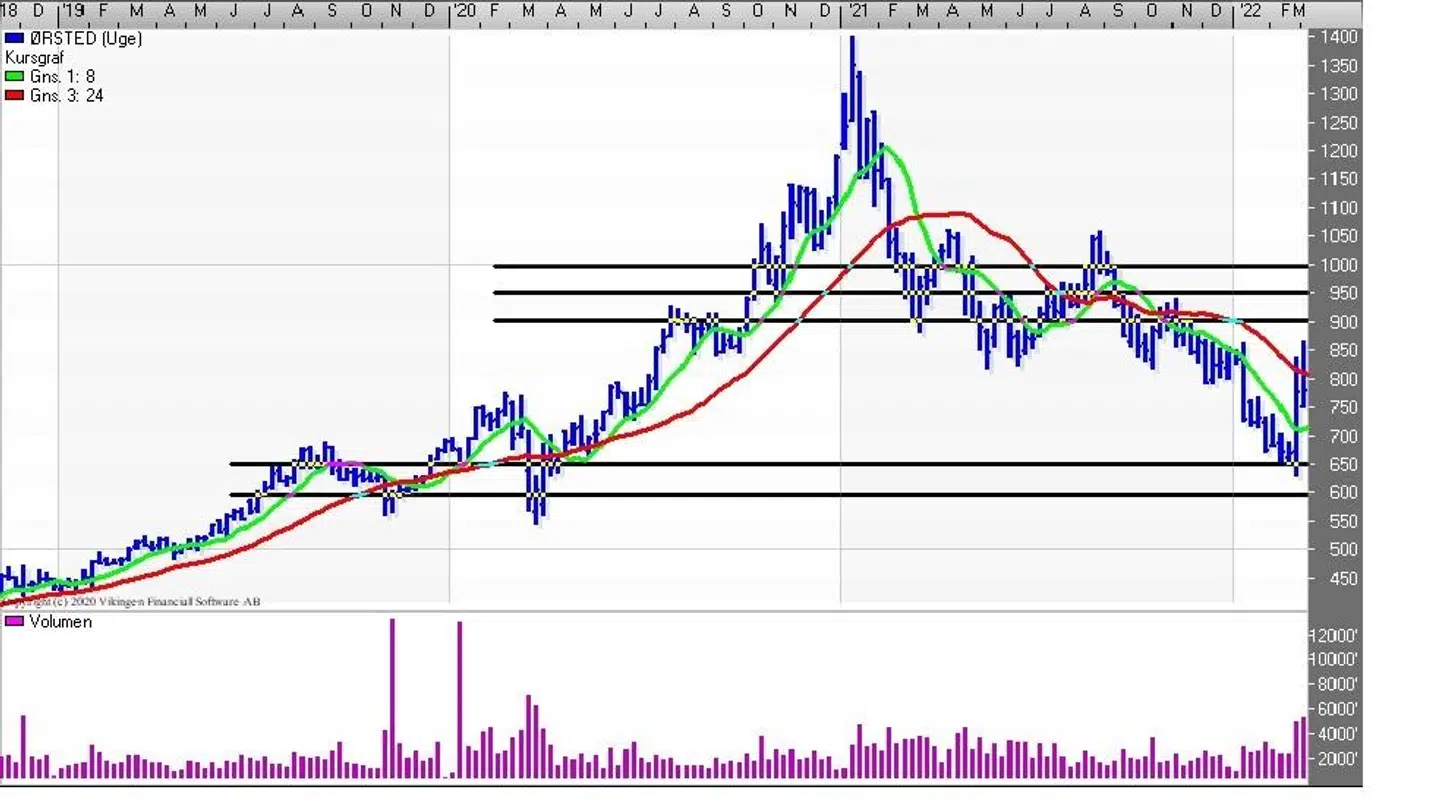 Ørsted-aktien toppede i januar 2021 i niveauet 1350-1400 og fredag sluttede aktien i 781,40. Den øgede interesse for de grønne aktier kan ses, i det omsætningen er steget meget de sidste to uger.