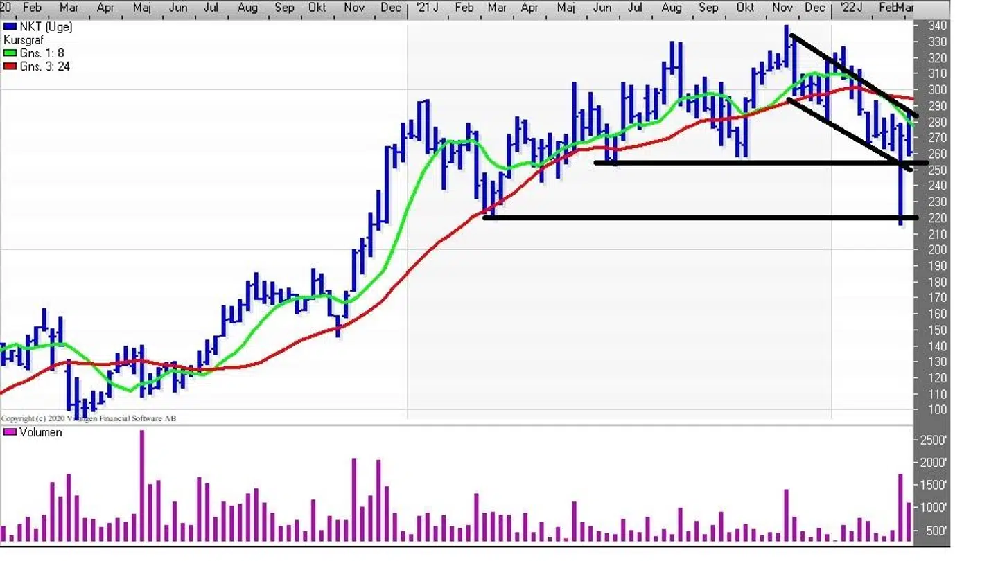 NKT har etableret en faldende tendens efter topformation i slutningen af november, hvor aktien blev handlet i niveauet 340 og fredag sluttede aktien i 261.