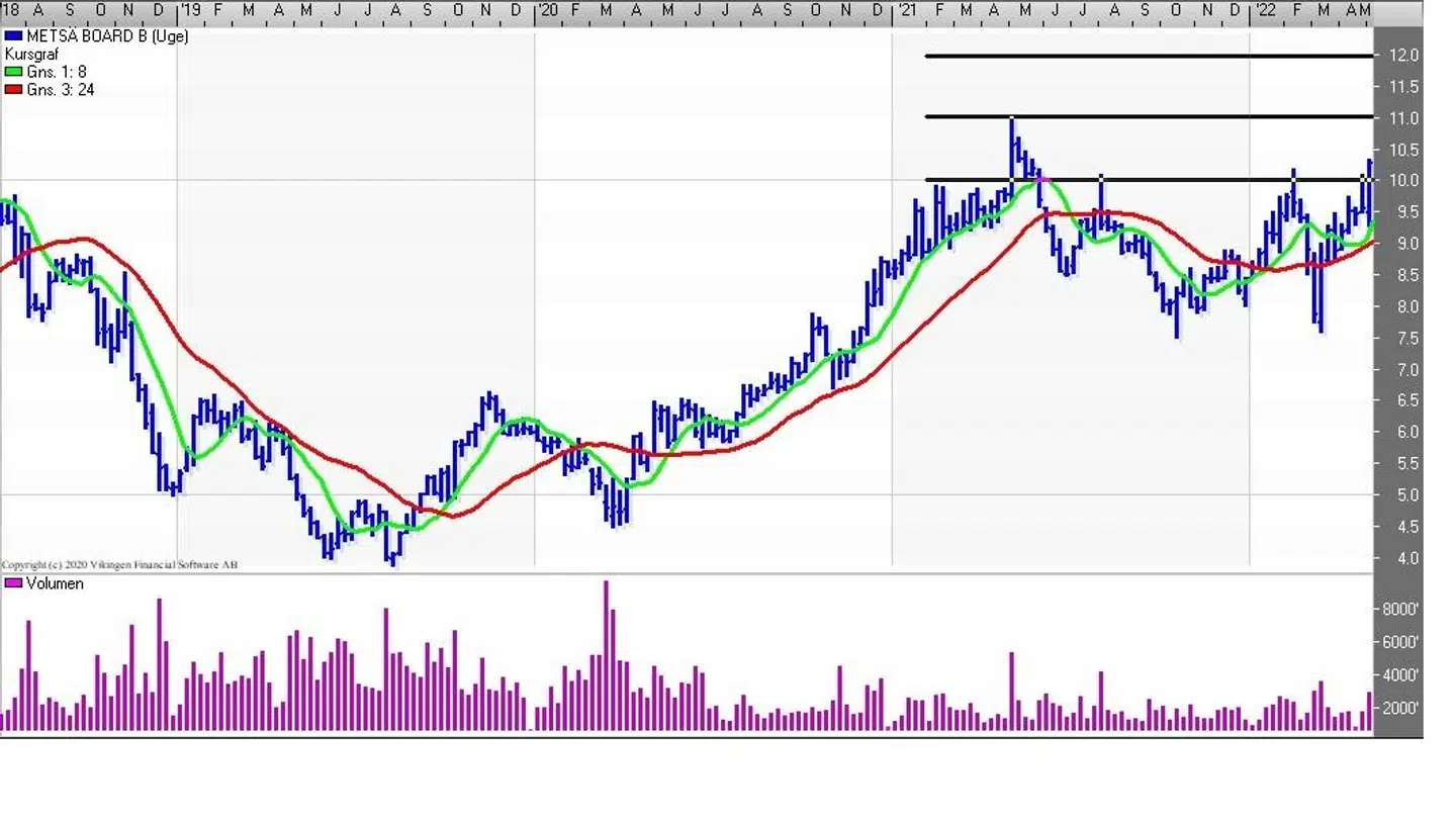 Aktien i Metsä Board har på dagsniveauet etableret et købssignal i Bollingerkanalen med fredagens stigning. De glidende gennemsnit etablerede et ”Golden Cross” i midten af marts, hvor det korte glidende gennemsnit er skåret igennem det lange glidende gennemsnit nedefra.