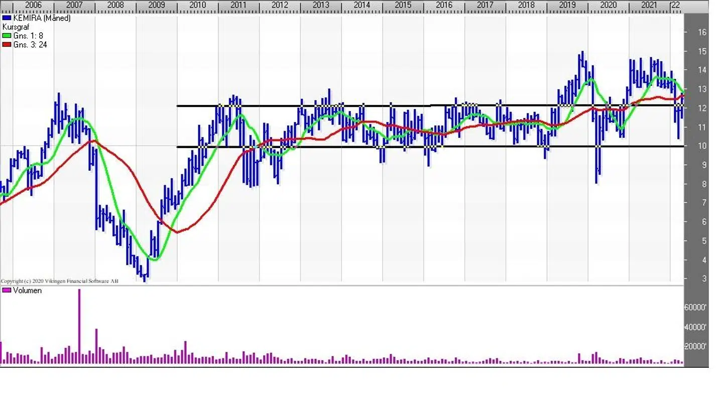 Siden 2013 har aktiekursen i Kemira bevæget sig vandret i niveauet 10-12.