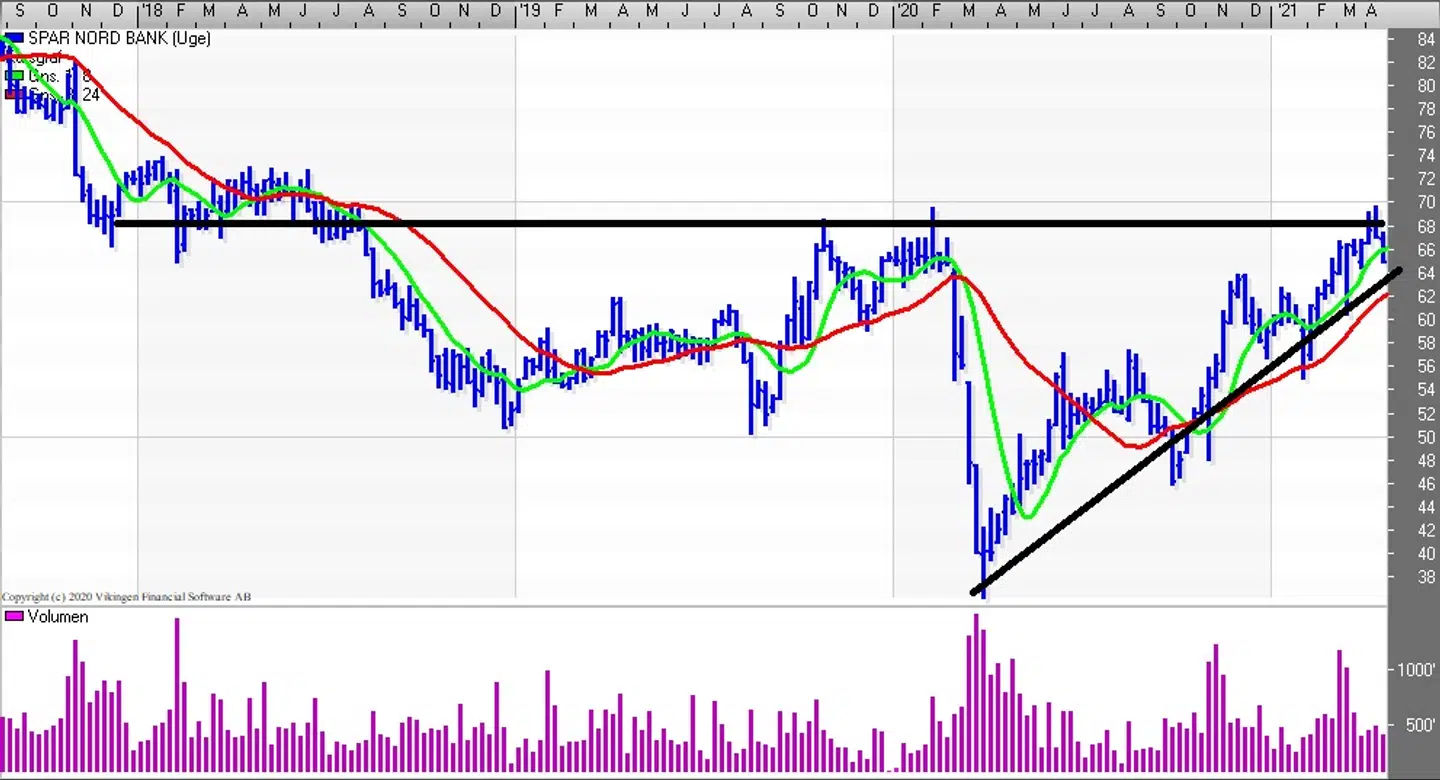 Toppen fra februar 2020 i niveauet 68 bliver testede igen men er endnu ikke blevet brudt. Spar Nord aktien toppede i 2017 i niveauet 87,9. Der er divergens mellem indikationsmodeller på ugebasis i det RSI er faldende og modellen har ramt niveauet 68 på ugebasis mens Momentum er stigende.