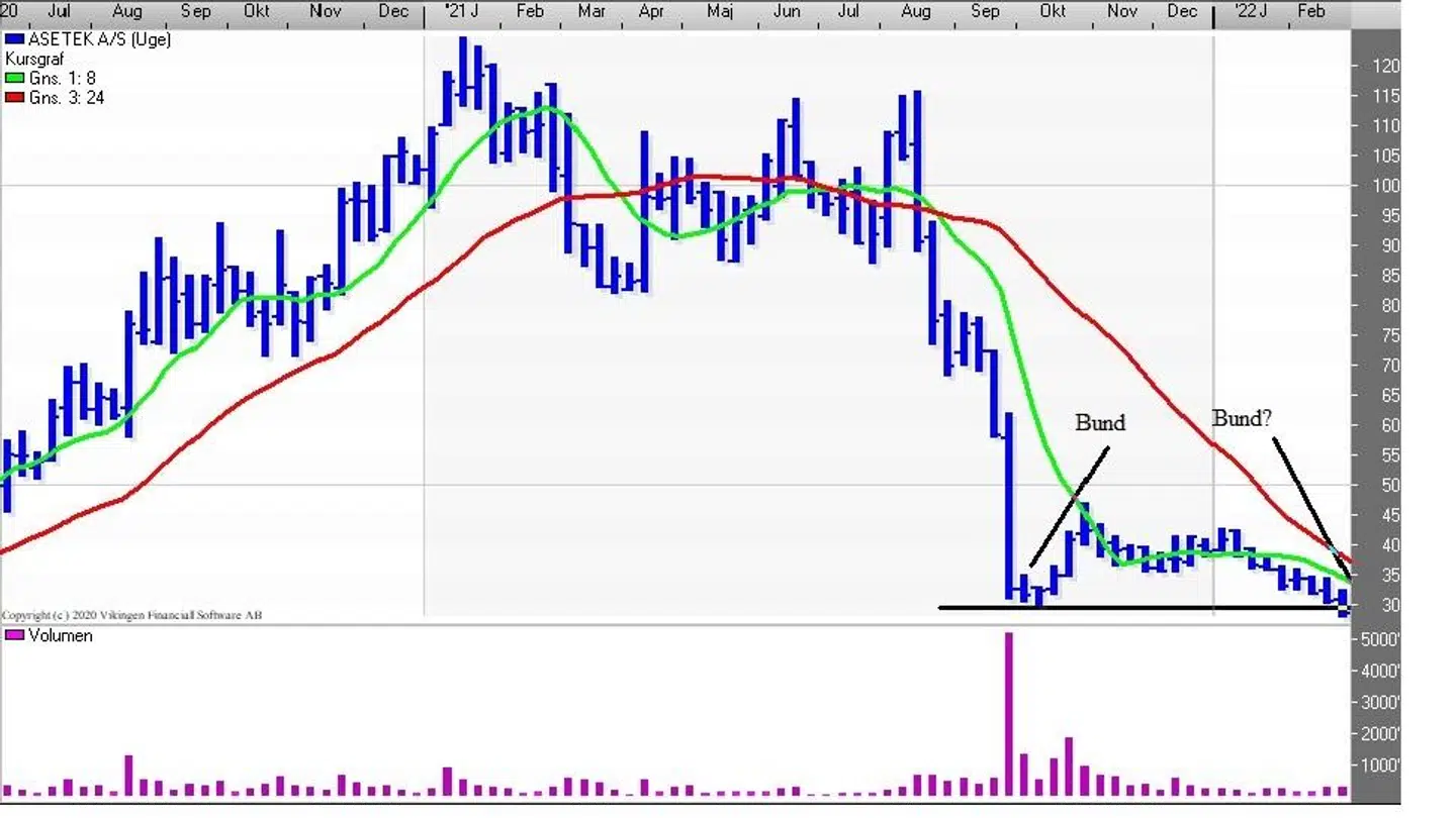 Asetek-aktien var en darling i 2016-2017 og 2020, men siden har kursen været i en faldende tendens og fredag lukkede aktien i 28.85, hvilket var en bund i månederne september/oktober sidste år. Holder støtteniveauet omkring 28-29, er der mulighed for, at der bliver etableret en dobbelt bund.