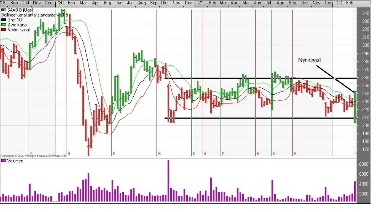 Aktiekursen i Saab-aktien har bevæget sig vandret i niveauet 200-260 siden efteråret 2020. Den vandrette formation i aktiekursen betyder, at der har været mange signalskift i perioden mellem køb og salg.