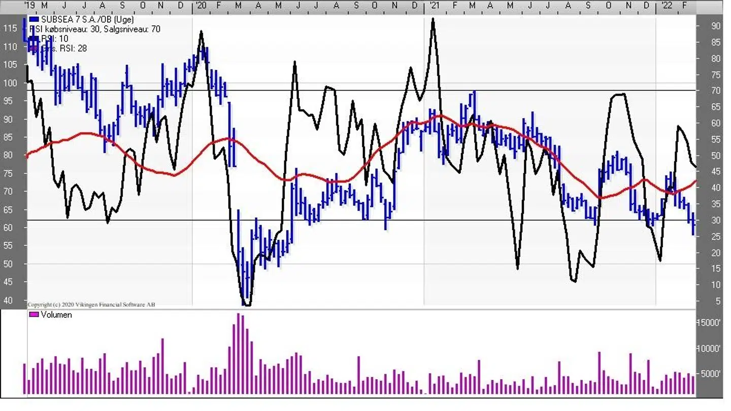 Nærmeste støtteniveau er ved 50 og herefter i niveauet 40, mens der er modstand i niveauet 75 og 80.