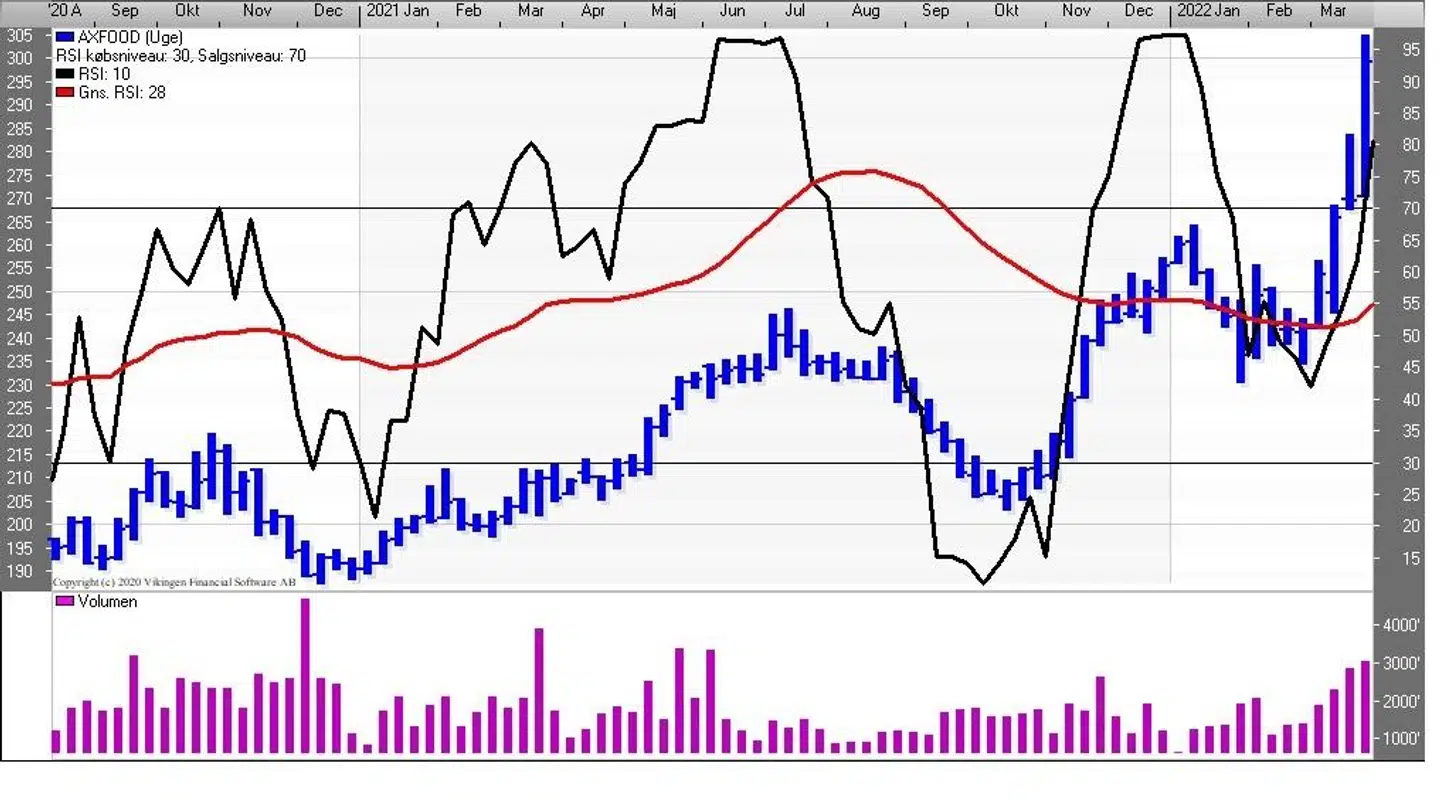 De sidste 3 uger har der været fart på Axfood-aktiekursen, som er gået fra 250 til 299,60. På dagsniveauet blev der etableret købssignal ved månedsskiftet februar/marts. De glidende gennemsnit har ligeledes etableret et ”Golden Cross” i slutningen af februar på dagsniveauet.