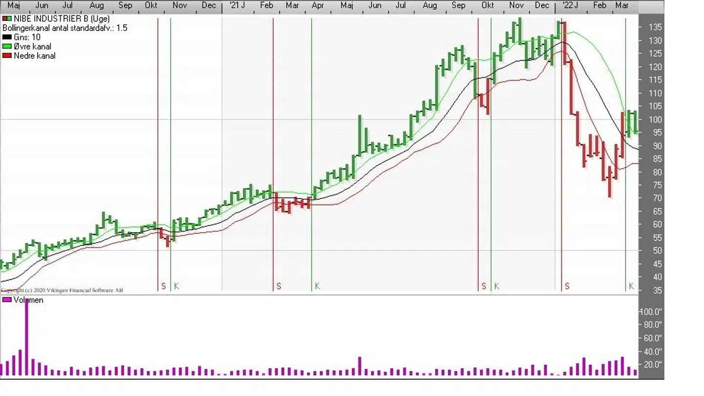 Nibe-aktien etablerede en top i november og i januar. Dermed var der skabt en dobbelt topformation. Det er ofte et negativt signal og aktien er også faldet tilbage i januar og februar fra 140 til 70. Siden testen af 70 er aktien steget og nu handles den i intervallet 95-103,25.