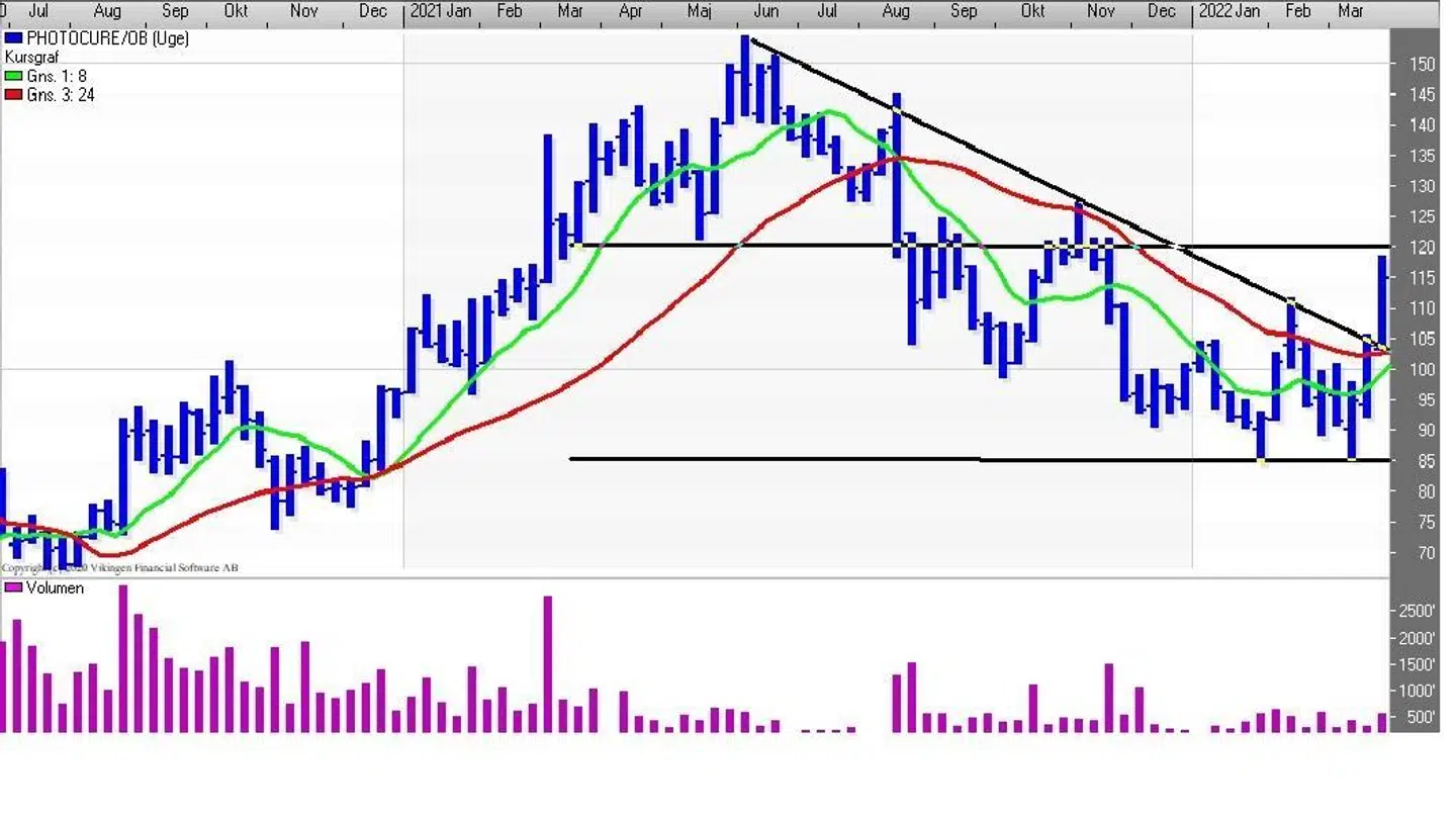Photocure-aktien toppede ved månedsskiftet maj/juni i niveauet 155 og siden har aktien været i en faldende tendens frem til midten af januar, hvor aktiekursen fandt støtte i niveauet 85 og det støtteniveau blev igen testet for 2 uger siden og støtteniveauet er ikke blevet brudt, hvilket er et positivt tegn.