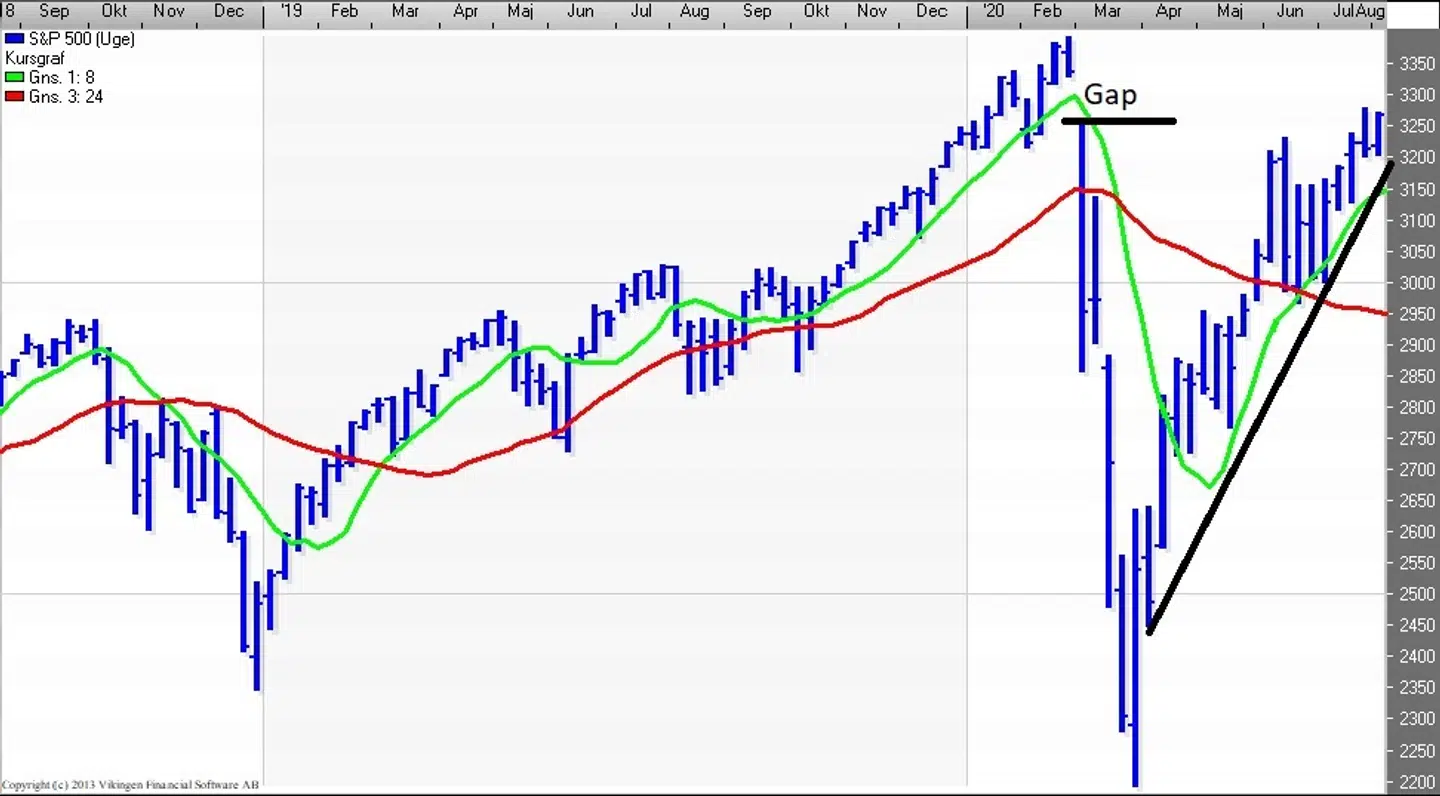 Det lange glidende gennemsnit på 24 uger ligger i niveauet 3000 som en støtteline. Indekset ser stærkt ud, men da flere investorer holder ferie i august, gør det at nogen markedsdeltagere mangler i en periode til at tage beslutninger. Jeg holder meget øje med det amerikanske marked i forhold til, om S&P 500 holder sig over 3200, og at der ikke kommer nogle mærkelige tweets fra Donald Trump, der kan rykke markedet.