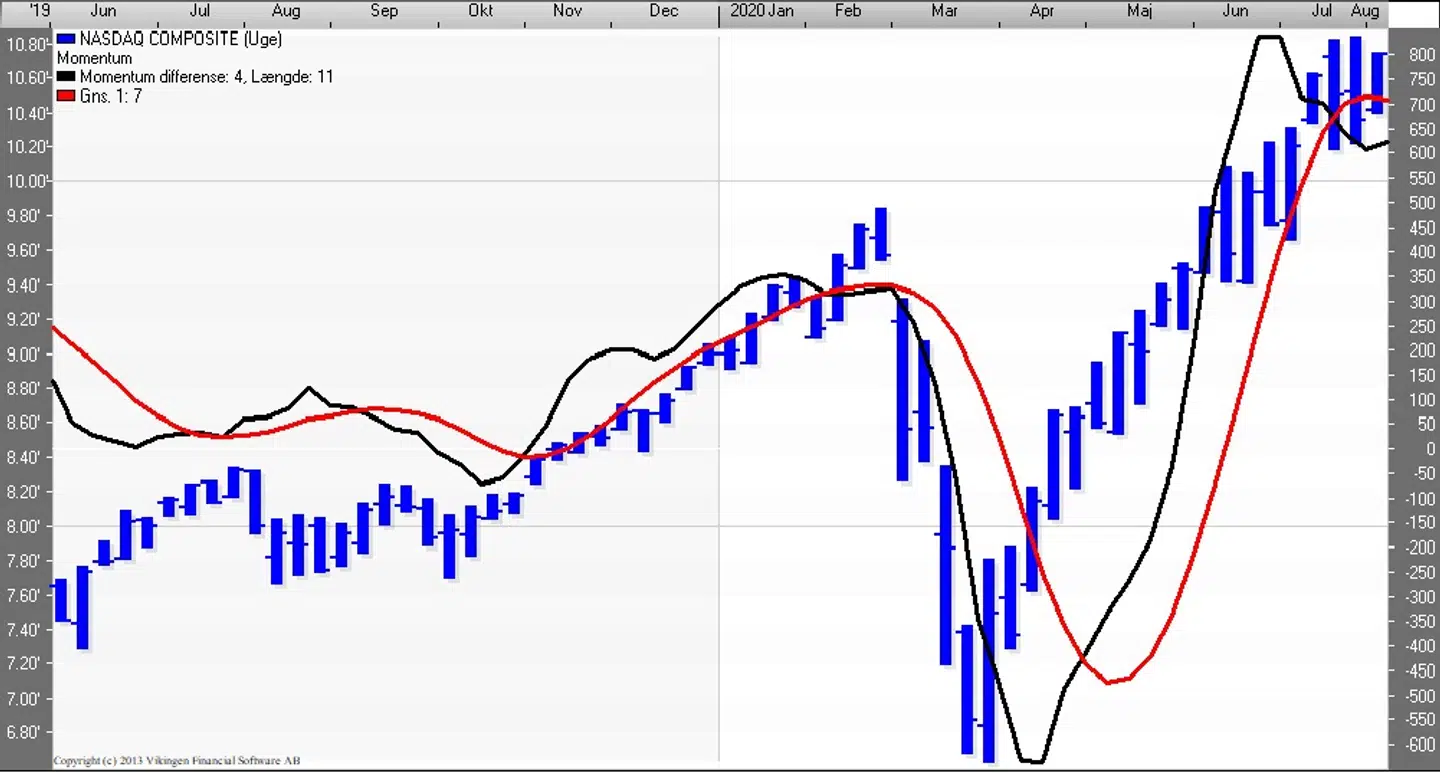 Der er ikke nogen tvivl, men IT-aktierne har været vinderne i denne omgang. Indekset er steget ca. 20 pct. De sidste 4 uger har indekset konsolideret sig i niveauet 10.500. Det har fået de tre indikationsmodeller til at falde tilbage på ugebasis. RSI er faldet fra 90 til 75 og den samme faldende tendens ses i Momentum på ugebasis.