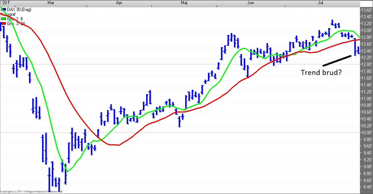DAX har nu været i en faldende tendens de sidste 8 dage. Indekset lå ellers i en fin stigende tendens, men faldet har ødelagt det positive billede på dagsniveauet og Bollingerkanalen er gået i salg.