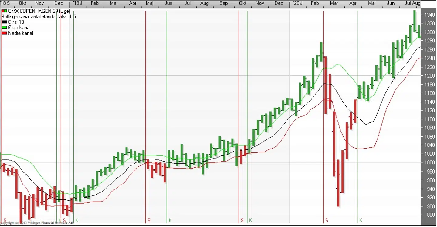 På ugebasis ser alle modellerne fortsat stærke ud, da der er en positiv tendens i både Momentum og RSI. RSI har ramt 70. Bollingerkanalen holder fast i sit købssignal fra maj. Den nedre kanallinie ligger i niveauet 3075 som en støttelinie, og den skal brydes oppefra og kursen skal lukke under den kanallinie, før signalet skifter i modellen.