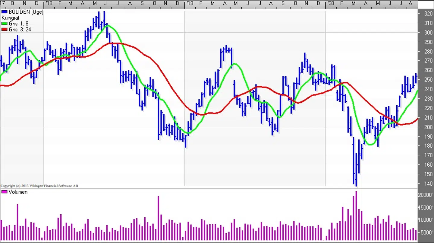 Boliden har været i en stigende tendens, siden aktien ramte niveauet 140 i midten af marts, mens aktien handles i niveauet 250-260. På dagsniveauet er der igen købssignal i Bollingerkanalen, og det er 5. købssignal siden midten af marts. På ugebasis er der købssignal i Bollingerkanalen, og det blev etableret i slutningen af april. Den nedre kanallinie ligger i niveauet 220 og bliver den brudt, så skifter signalet til salg fra køb.