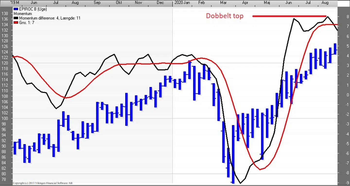 Epiroc er et spin off af Atlas Copco, og aktien har været på børsen siden sommeren 2018, hvor aktien blev handlet i niveauet 79-87. Coronabunden var i niveauet 76,5 i marts, og der handles aktien i niveauet 124-127. Der har været købssignal i aktien siden begyndelsen af maj på ugebasis, og de glidende gennemsnit har etableret et ”Golden Cross” i midten af juni. Der er divergens mellem de tre indikationsmodeller på ugebasis, i det RSI stiger og er over 80, mens Momentum har etableret en dobbelt top og er faldet tilbage igennem det glidende gennemsnit.