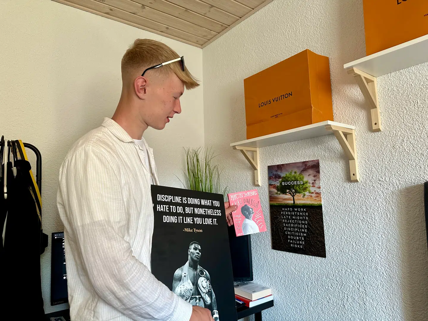 »Man starter med en lille rod, og der er langt vej op, men man lærer af at fejle, og så bygger det her træ sig op og bliver stærkere og stærkere,« fortæller Mads, der han bliver spurgt ind til plakaterne.