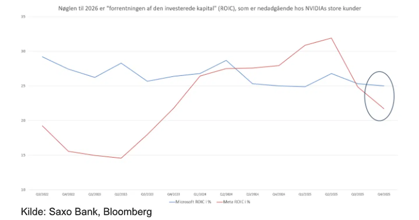 Fortsætter trenden ned af kan det tyde på at der er blevet overinvesteret, men stabiliserer ROIC sig eller stiger, vil markedet anerkende, at de mange milliarder dollar i AI-investeringer begynder at bære frugt.
