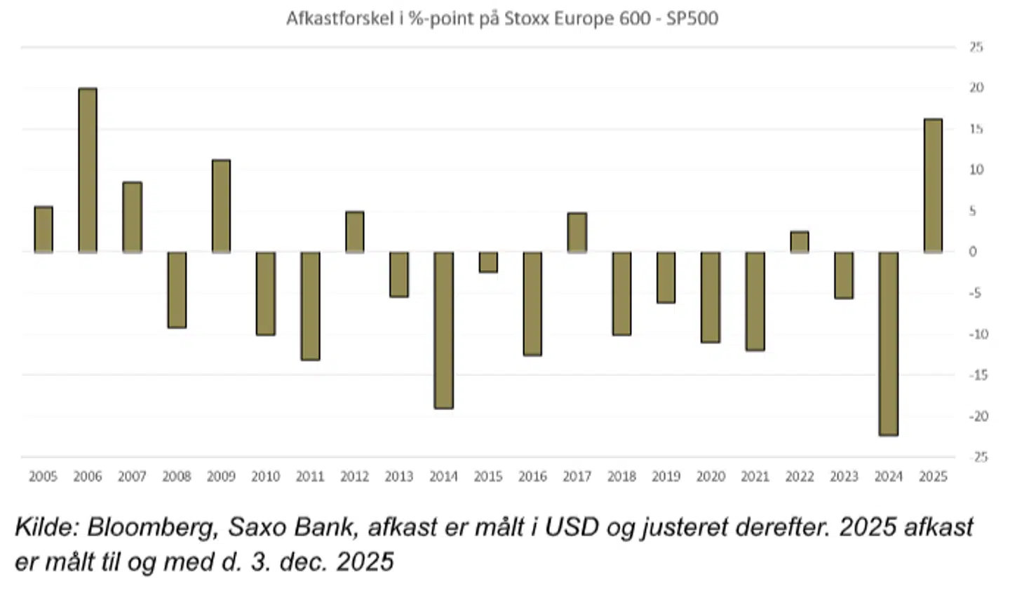 Skal de to indeks derfor tættere på det historiske værdiansættelsesspænd til næste år, kan det som investor give mening at investere i europæiske aktier frem for amerikanske, også i 2026.