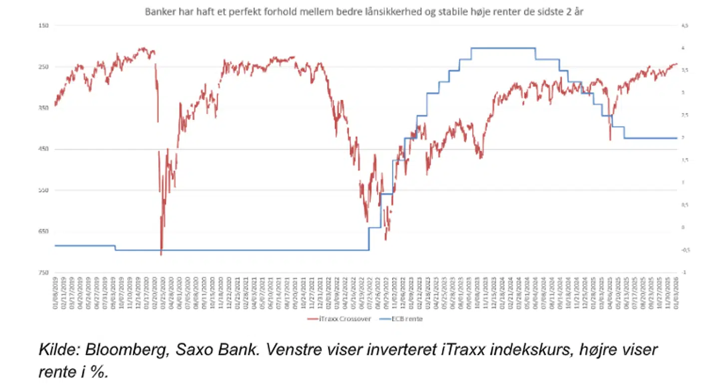 Skulle der f.eks. opstå bekymring om europæisk vækst i løbet af 2026 bør dette få det førnævnte iTraxx Crossover indeks til at stige og samtidig betyde lavere renter fra ECB, og det kan komme til at ramme forventningerne til bankernes fremtidig vækst og indtjening markant.