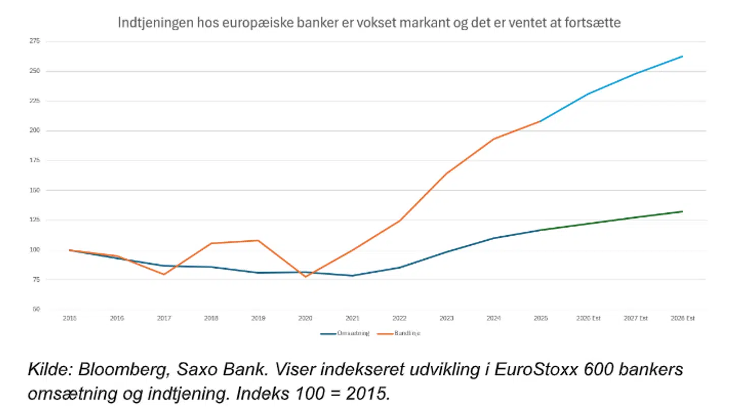 Som sektor har banker i StoxxEurope 600 indekset givet hele 76,7 pct. i afkast i 2025, hvis man medregner dividender. Den samme imponerende performance kan man ligeledes se hos flere af de danske bankaktier i 2025, hvor Jyske Bank er steget næsten 80 pct., Danske Bank 65 pct., og Nordea er steget 64 pct. i det forgangne år.