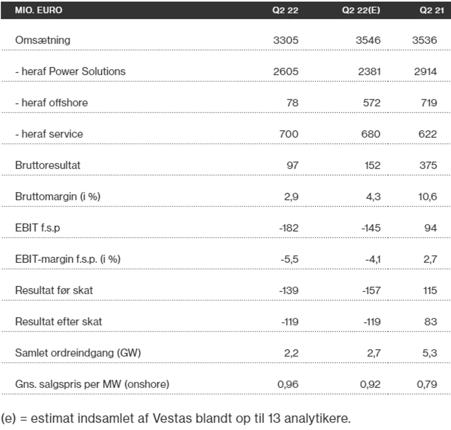 Tabel over Vestas' regnskab for andet kvartal 2022: