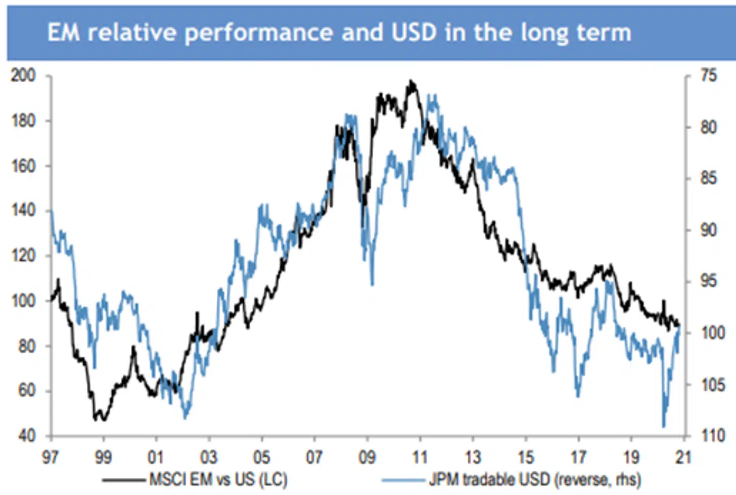 Målt i det lokale emerging markets-lands valuta skrumper gælden, når den amerikanske dollar bliver svagere, lyder det.