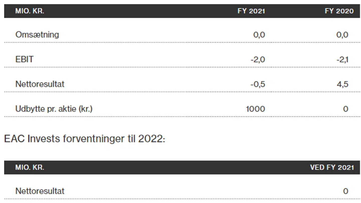 Udsigten til det store udbytte vil formentlig få flere til at springe let henover selve driftsudviklingen i 2021. Der var nemlig ikke så meget af skrive hjem om, da selskabet først og fremmest er ejer af minoritetsposter i andre virksomheder.