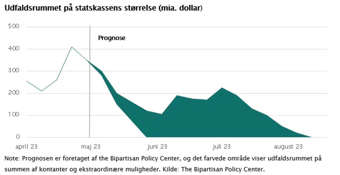 Yellen, har udtalt, at x-dagen kan være så tidligt som 1. juni, mens prognoser fra the Bipartisan Policy Center viser, at det reelt kan være mellem 1. juni og midten af august.
