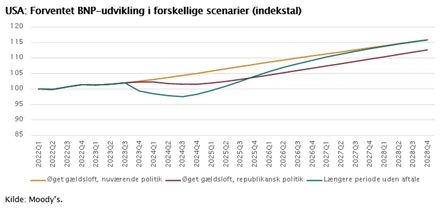 Analysen viser desuden, at et forløb med en længerevarende periode uden adgang til gæld vil medføre en negativ vækstpåvirkning på amerikansk økonomi frem mod 2027.