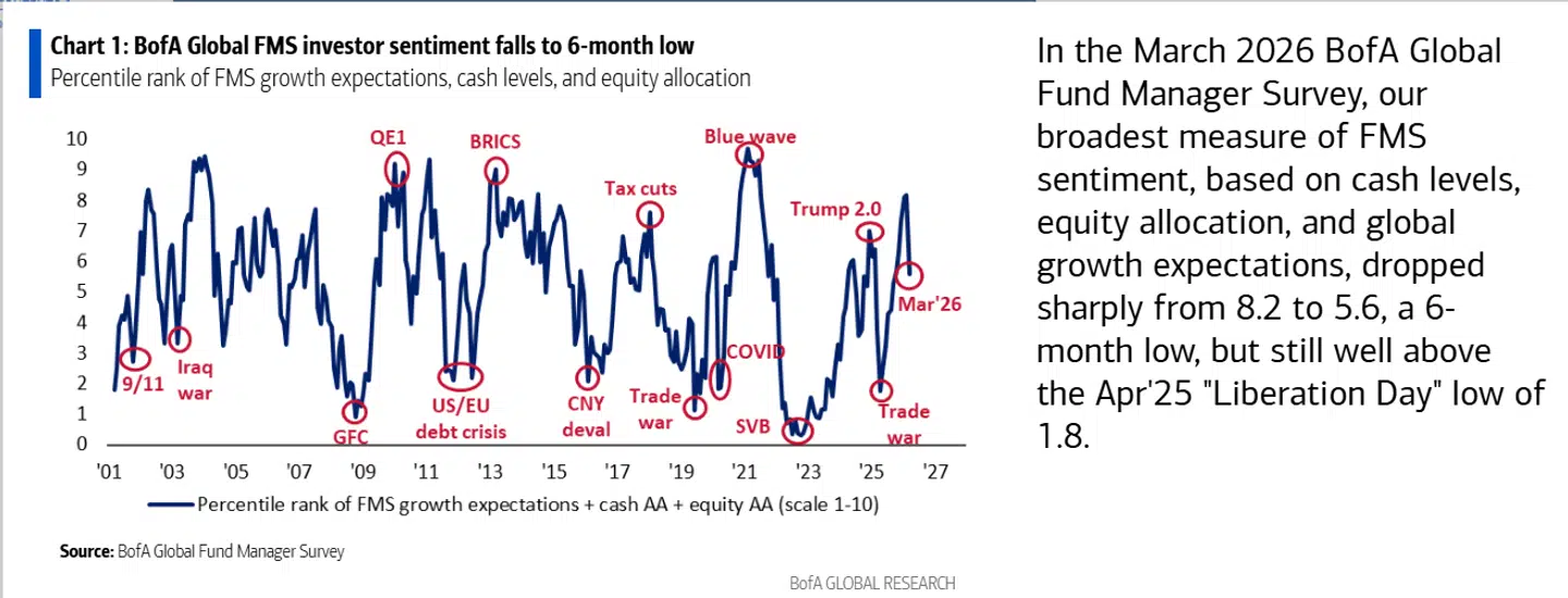I den friske rapport fremgår det at investorernes humør bliver dæmpet af krigen i Iran og bekymringerne over tilstanden i det private lånemarked (private credit, red.).