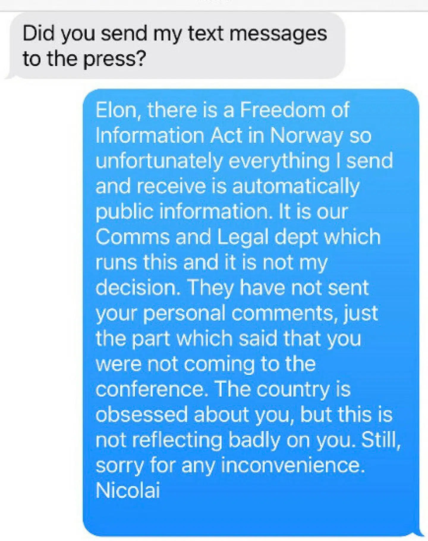 'Elon, der er en offentlig oplysningslov i Norge, så desværre er alt, hvad jeg sender og modtager, automatisk offentlig information. Det er vores kommunikations- og juridiske afdeling, der håndterer dette, og det er ikke min beslutning,' starter beskeden fra oliechefen.