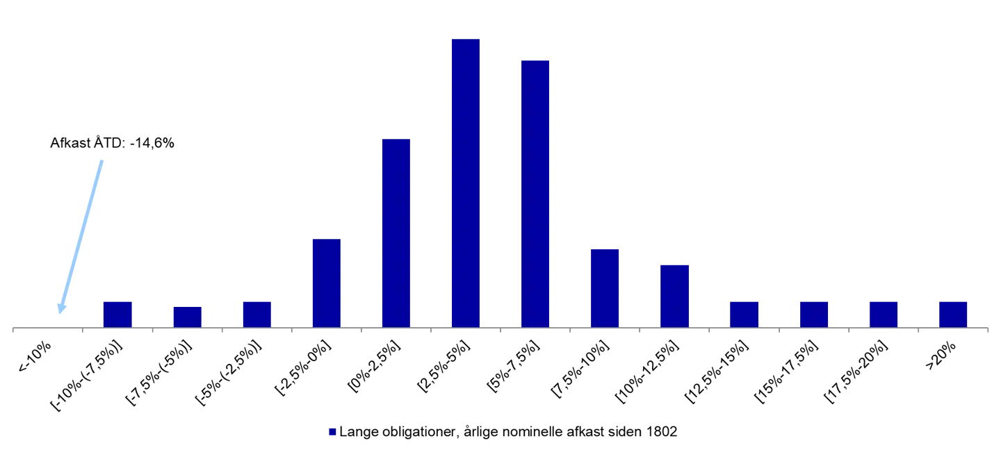 » Graver vi lidt i de historiske data, så er afkastene på lange obligationer faktisk helt uden for skalaen,« lyder det fra chefstrategen, der henviser til nedenstående graf: