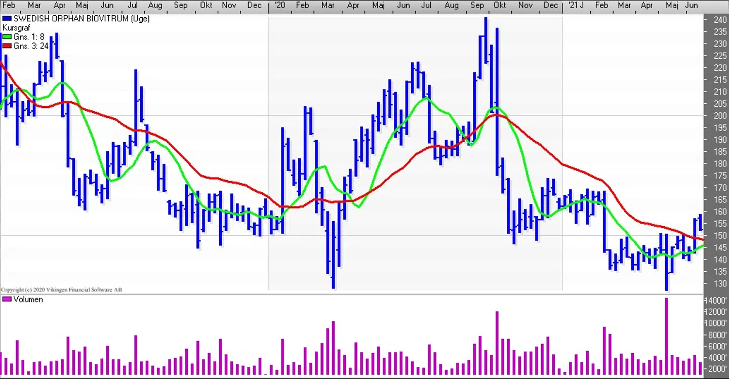Sobi-aktien er ved at genfinde lidt Momentum efter at have bevæget sig vandret i 3 måneder. Den vandrette formation på dagsniveauet betyder, at Bollingerkanalen flere gang er skiftet fra køb til salg. For 10 dage siden blev der etableret et købssignal og de glidende gennemsnit på 8 og 24 dage etablerede et ”Golden Cross” i midten af maj, som så blev testet i slutningen og nu holder tendensen. Det lange glidende gennemsnit er i niveauet 147 som en støttelinie.