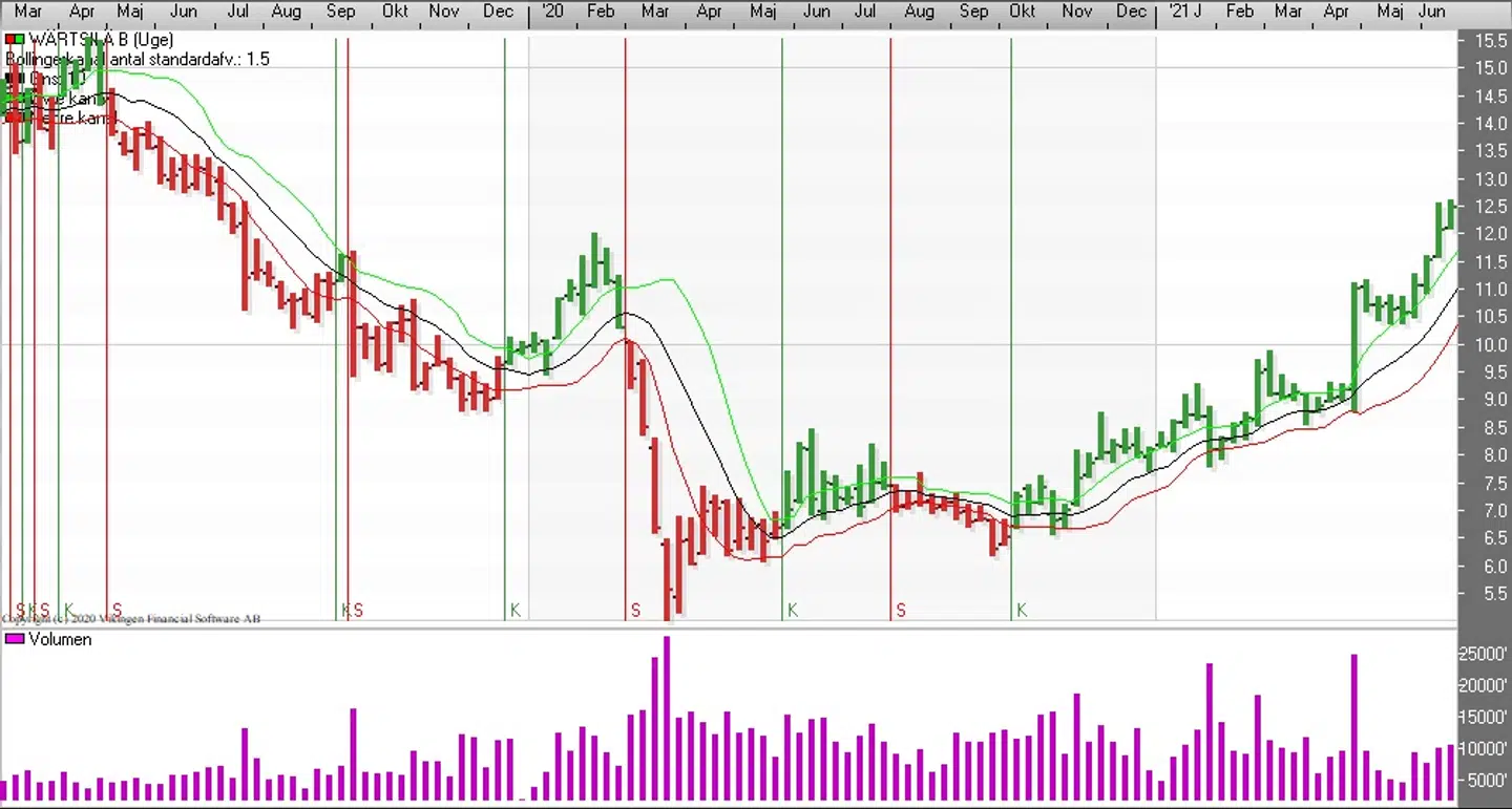 Wärtsilä etablerede en dobbelt bundformation ved test af niveauet 6,08-6,18. Den første bundformation var i maj og anden bund var i september, og siden har aktien været i en stigende tendens. Undervejs har der været et par salgssignaler i Bollingerkanalen på dagsniveauet og det lange glidende gennemsnit er blevet brudt et par gange, men kursen er kommet tilbage i den stigende tendens og over det lange glidende gennemsnit.